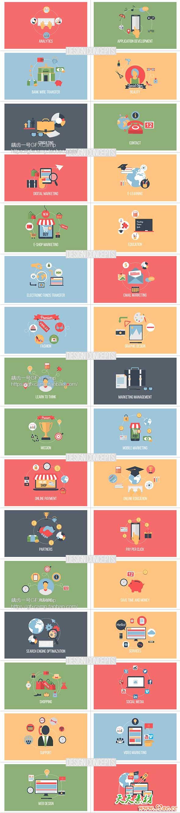 包含商业,工作,食物,教育,消遣,人物,表情,企业,公司,娱乐,网络,APP等一共1500个图标Icon动画背景,图标的颜色都可以自定义修改,十分简单