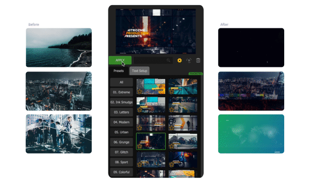 包含16种分类(现代时尚、图形遮罩、信号损坏、运动、企业商务、复古、水墨、文字遮罩、科技感等)共1500预设,每种预设都有多种参数可以调节,而且不同预设可以叠加使用,通过移动图层标记点可以快速修改动画的出入位置,使用简单