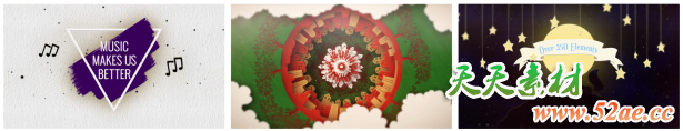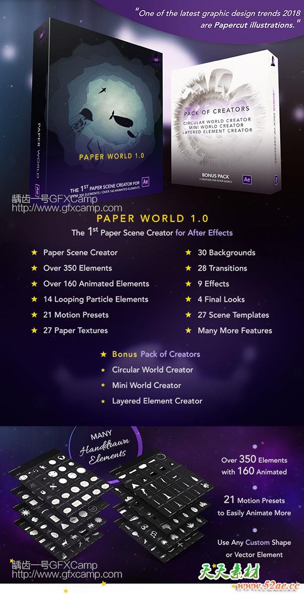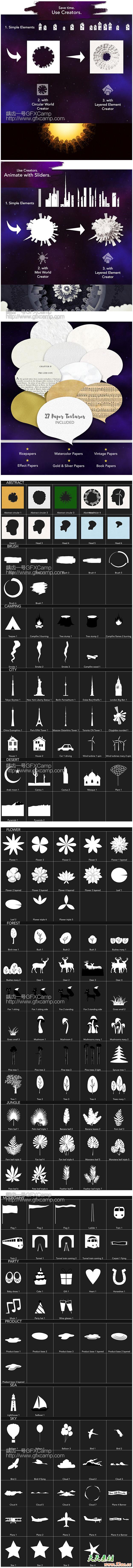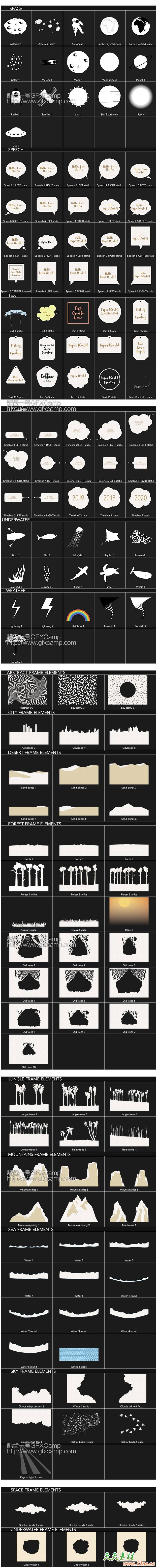 包含27个制作好的场景动画+350个小元素+14个循环粒子背景+41个运动预设+27张纸张材质+30个背景+28个转场+9个特效,元素可以自己随意搭配,制作自己的场景动画