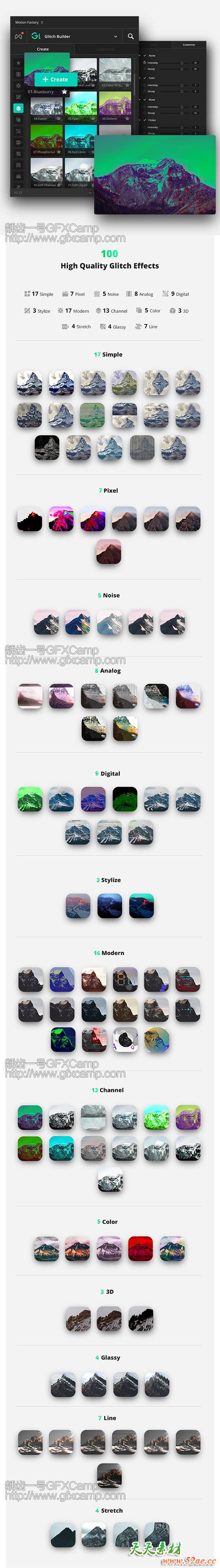 包含Glitch Bulider分类下的13个分类共101组效果,全部解锁,选中图层,点击需要的效果即可直接生成,十分简单,方便制作信号损坏、色彩分类、复古颜色效果等,修复支持中文/英文AE,不会出现任何表达式错误