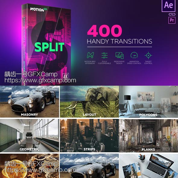 包含400组AE图形切割遮罩视频转场预设,包含AE模板和脚本形式,两者任意使用一种均可