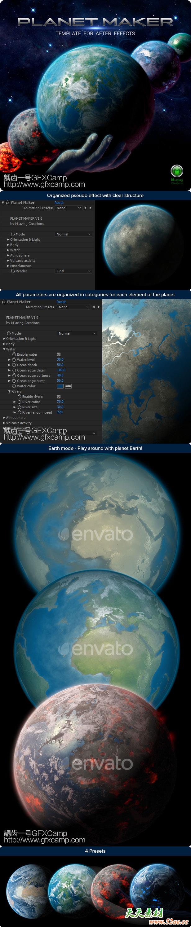 星球表面的多种参数可以修改,添加陨石坑、海洋、水流、火山、星球环等,所有的颜色、光源反射、旋转、大小等都可以修改,默认包含4种星球效果预设