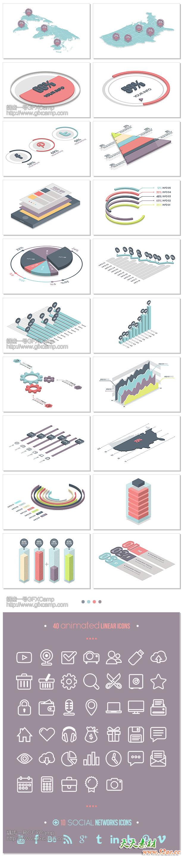 21种数据表格动画,每种包含两个摄像机镜头,每种数据表格的数据、颜色等多种参数可以直接修改