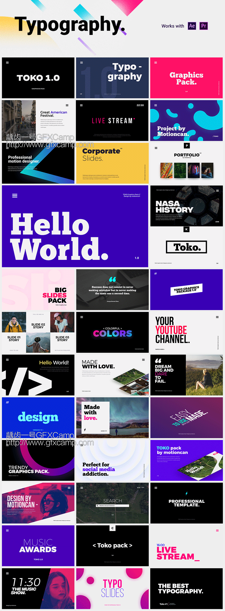 超过750组图形元素、文字排版、标题字幕、Logo动画、背景元素等,所有的元素都支持AE和PR,所有元素的颜色、位置、大小、文字、Logo等都可以修改,包含GIF动图预览,方便查找使用