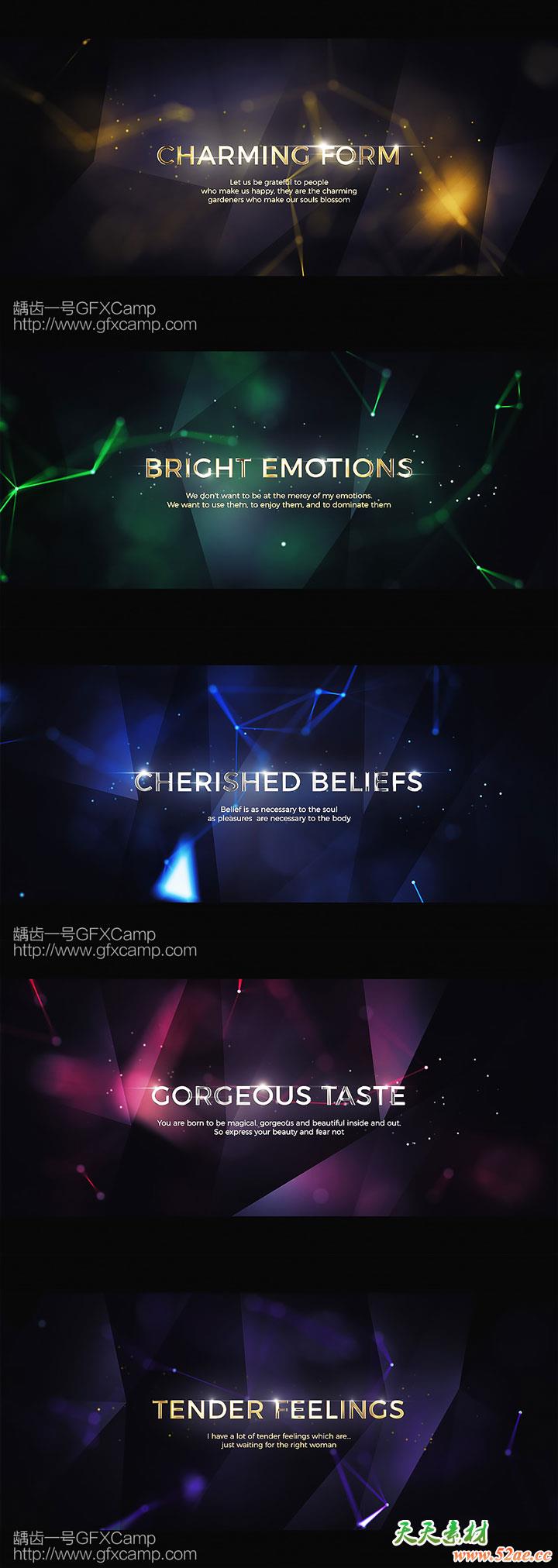 文字可以随意修改,包含几种预设好的颜色效果,包含插件版本工程(Plexus, Trapcode Particular, Trapcode Mir)和无需插件版本的工程可以使用