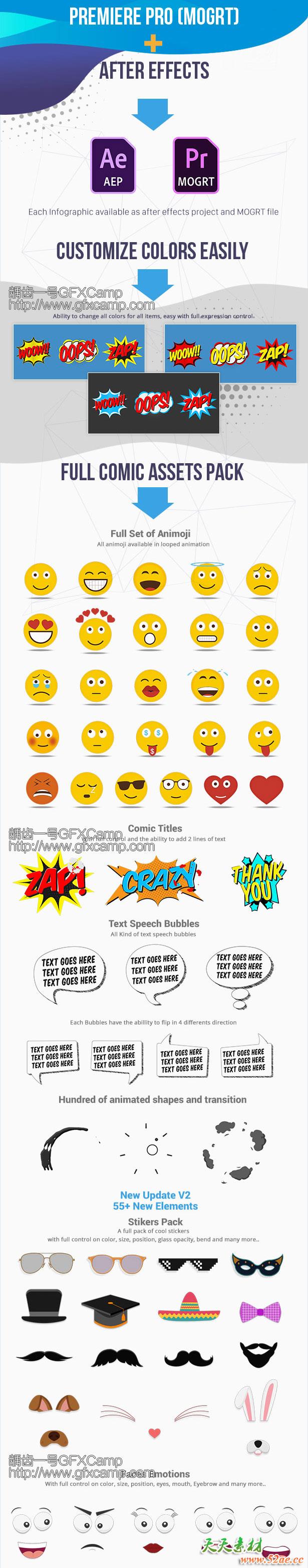 包含Emoji表情动画、文字标题、对话框气泡、卡通面部装饰元素等一共300+元素动画,同时支持AE和PR