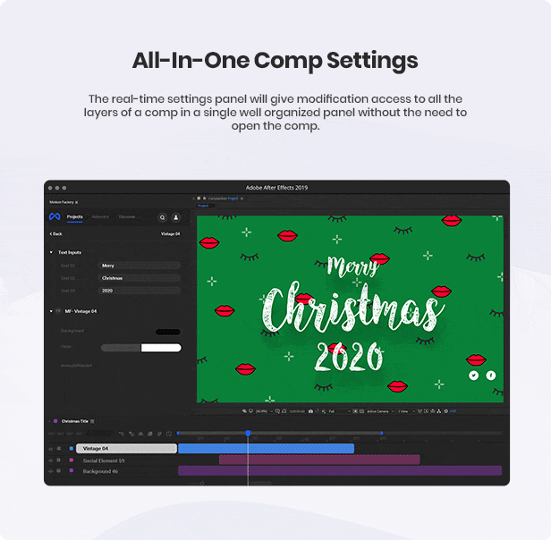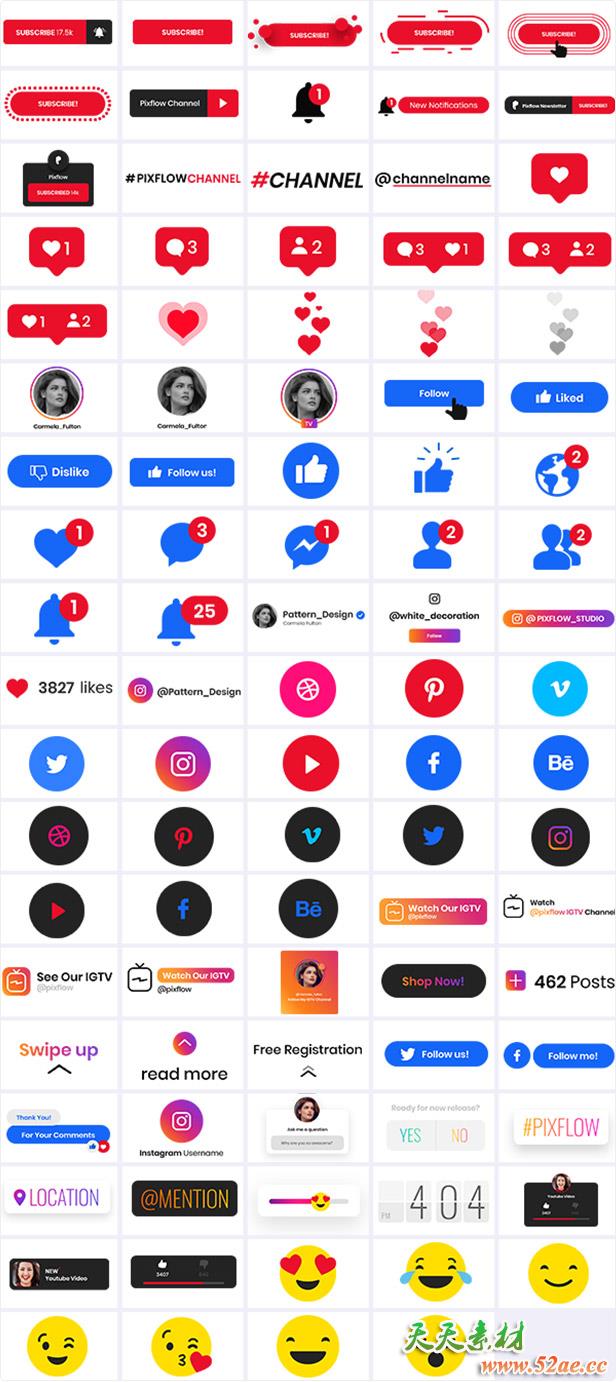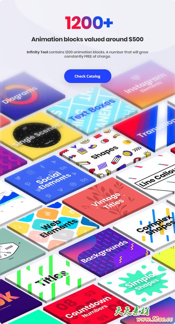 • 一共包含1200+动画预设,包括文字标题、图形转场、背景、文字排版、INS竖屏场景动画、数据信息图表、指示线动画、复古文字标题、社交图标动画等,支持AE CC 2019/2019 + Premiere CC 2019