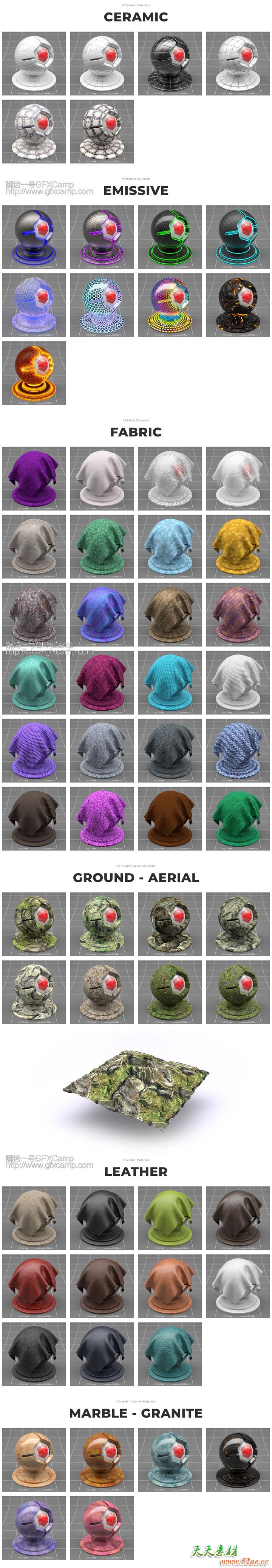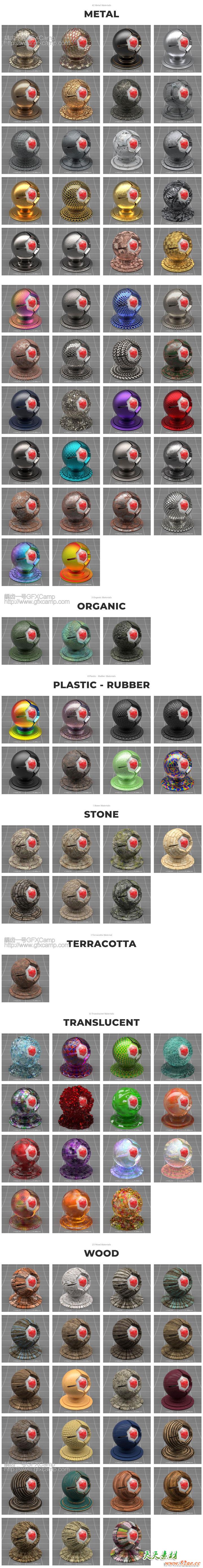 一共包含163个Redshift渲染器用的C4D材质预设,有陶瓷材质、布料材质、放射性材质、地面材质、皮革材质、钢铁材质、有机材质、大理石材质、塑料材质、橡胶材质、石头材质、透明材质、木纹材质等,绝大部分都是无缝衔接的,污垢划痕等细节程度都是可以调节的