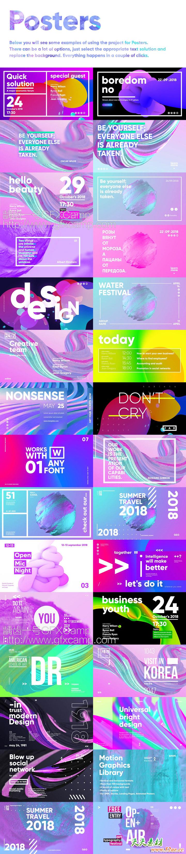 包含70组抽象背景+80组竖屏文字标题效果+40组横批文字标题效果,背景和文字标题可以随意拖拽配合使用,标题的文字、字体、颜色、大小文字等参数都可以修改