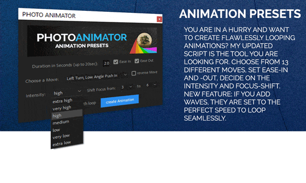 可以将静止的图片制作成有立体感的三维空间动画视频效果,包括摄像机前后推拉,焦距景深的自定义改变,边缘的模糊等多种效果,只需要在图片上给主体画个mask遮罩即可完成这些效果,强烈推荐!