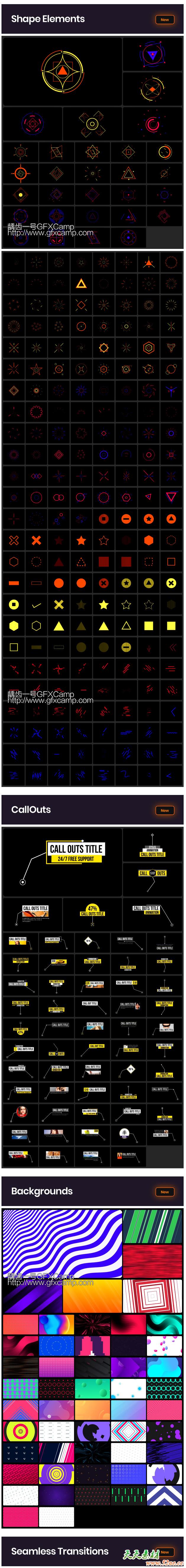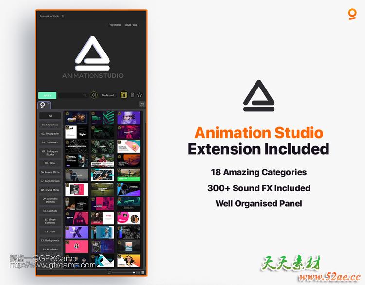 - 包括文字图片视频排版、文字标题、图形动画、视频转场、竖屏包装、图形转场、图标动画、信息数据图表、呼叫指示线、视频调色滤镜、音效等一共2000+横屏,包含AnimationStudio脚本形式,可视化,需要什么效果点击生成即可,使用很方便简单,支持AE CC 2018或者更高版本,修复支持中文版/英文版AE,不会出现表达式错误