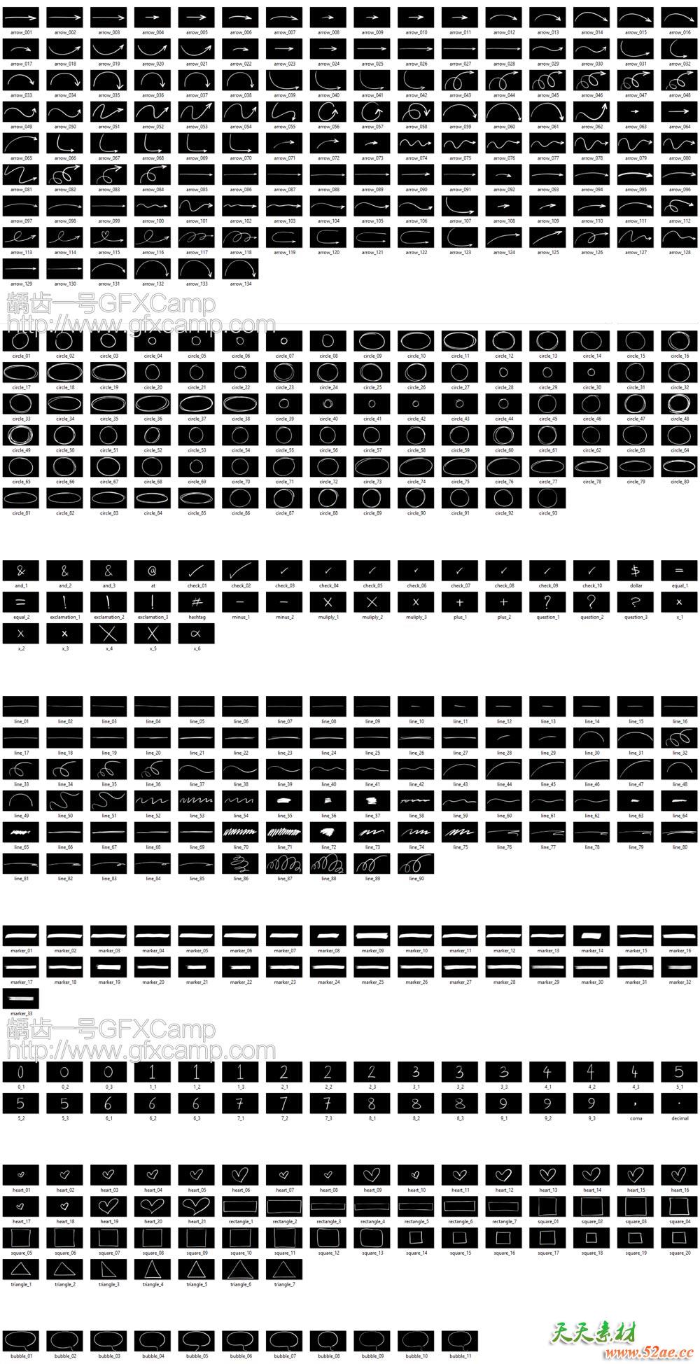 包含箭头、圆圈、数字、方框、气泡、加减乘除、√、X、线条等多种手绘风格元素动画,包含AE工程+渲染好的视频素材两种形式