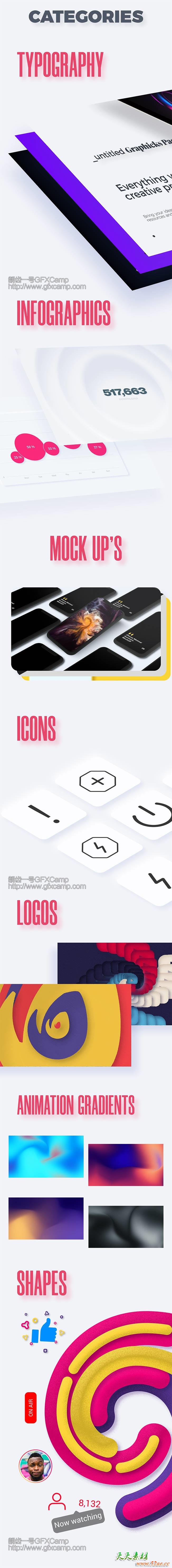 包含文字标题、背景动画、字幕条、Logo动画、排版动画、信息数据动画等14个分类共1400+动画元素,包含动图预览,方便查找使用