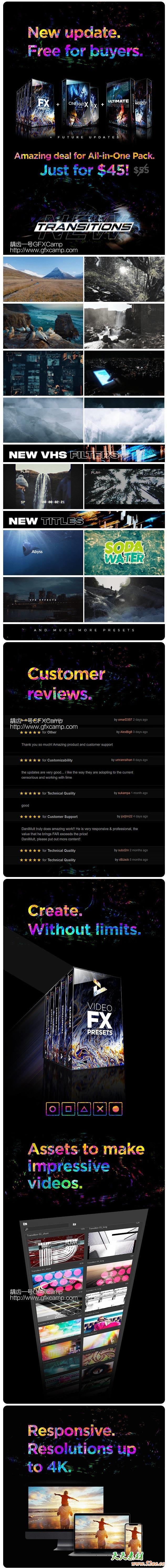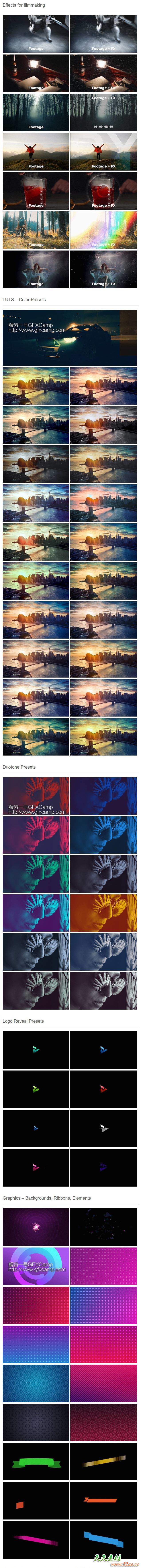 包含各种视频转场、视频特效、调色预设、文字标题字幕、音效等一共1000+动画,prproj工程文件形式,拖到PR里打开使用即可