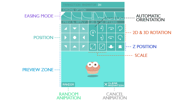 - 可以选择出入动画的风格类型(6种弹性动画模式+位置旋转大小属性),一键即可修改设置动画,十分简单
