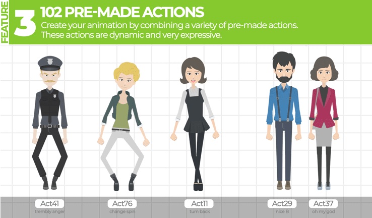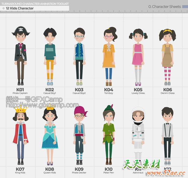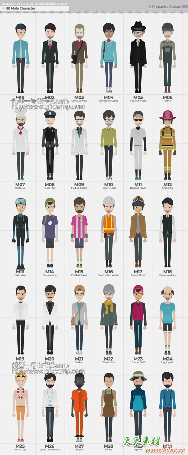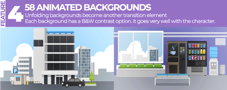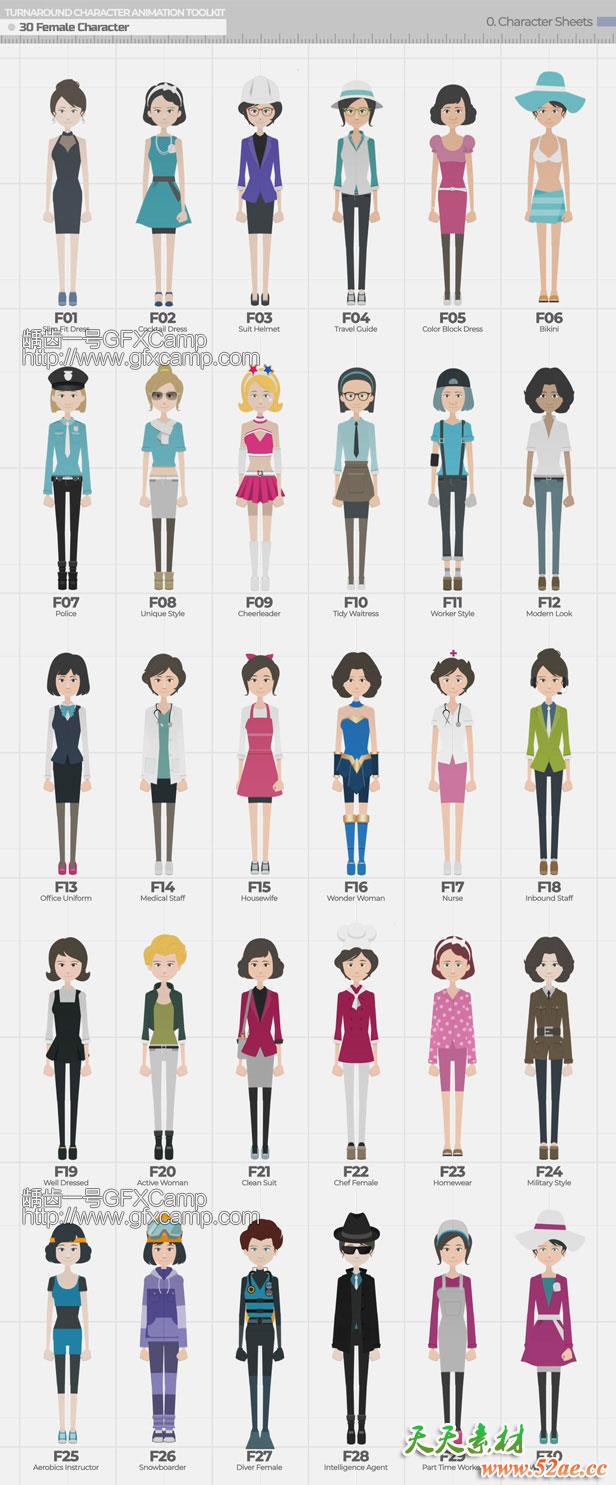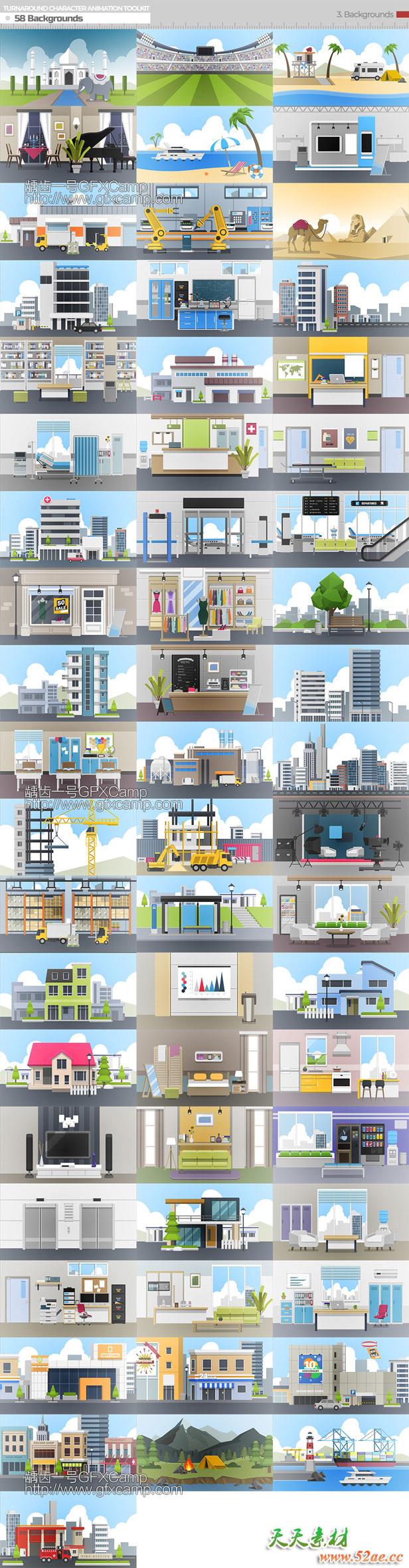 - 包含72个制作好的人物角色(30个男性+30个女性+12个儿童)+120个人物动作+58个场景背景+200个图标动画+80个其他小元素