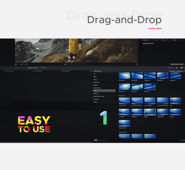 - 包含700组无缝视频转场/音效/视频素材/调色LUTS预设,拖拽即可使用