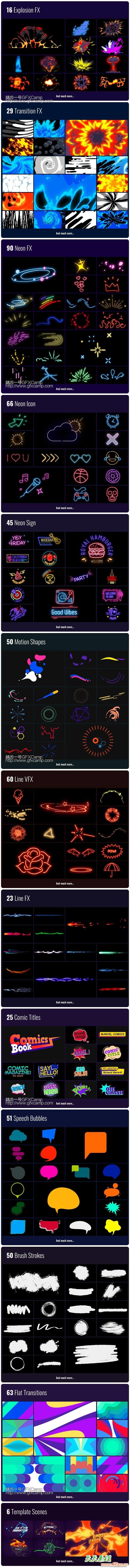 包含火焰、电流、爆炸、霓虹灯元素、水流、烟雾、对话框气泡、线条动画、文字标题等800+元素动画,通过Motion Factory脚本调用(已包含),可视化操作十分方便,需要AE或者Premiere CC 2019或者更高版本,低版本无法使用