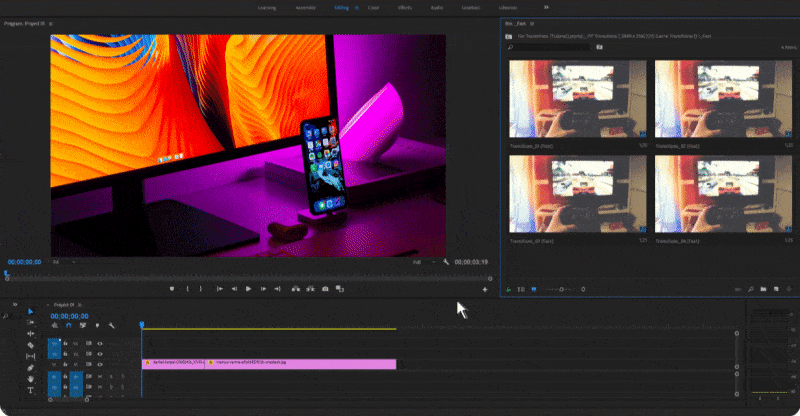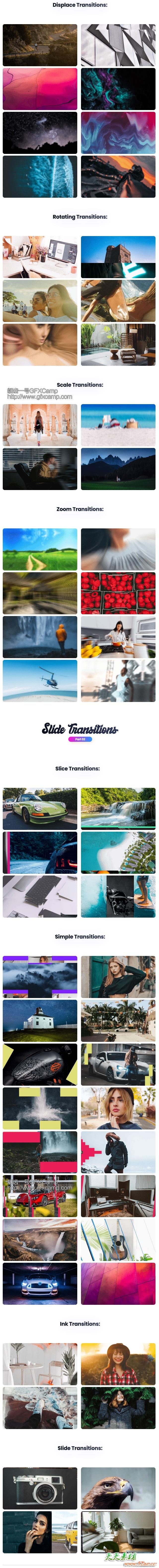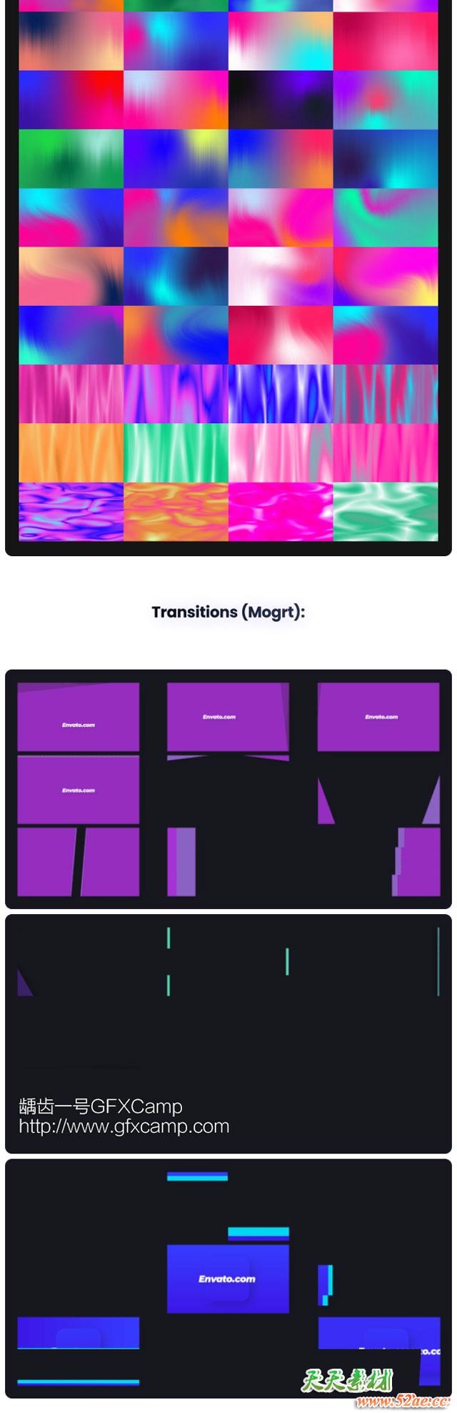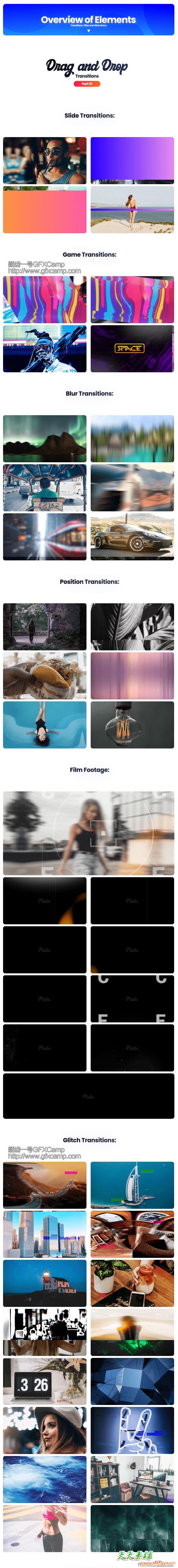 - 640+无缝视频转场,比如推拉聚焦冲击、平移、旋转、信号损坏、透视移动、抖动、切割扭曲、淡入淡出等转场效果,prproj格式,直接拖拽到两个视频中间即可,使用简单,多种分辨率可以选择使用