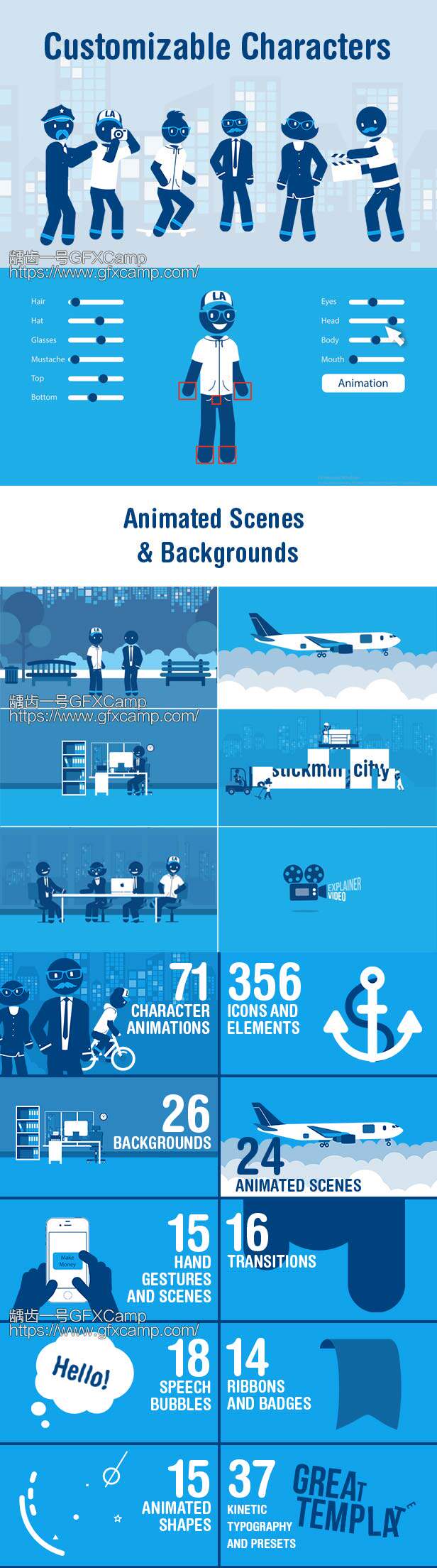 - 356个图标Icon动画+26个背景场景动画+24个动态场景+15个手势动画+16个转场+18个对话框气泡+14个条幅动画+15个MG图形动画+37个文字标题排版