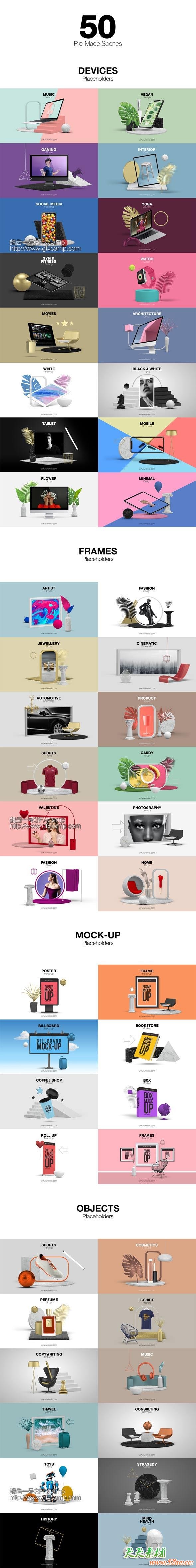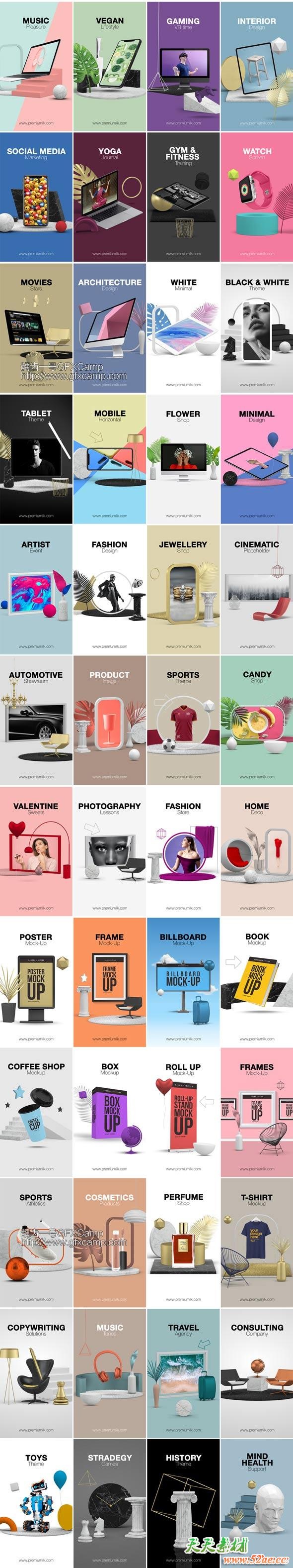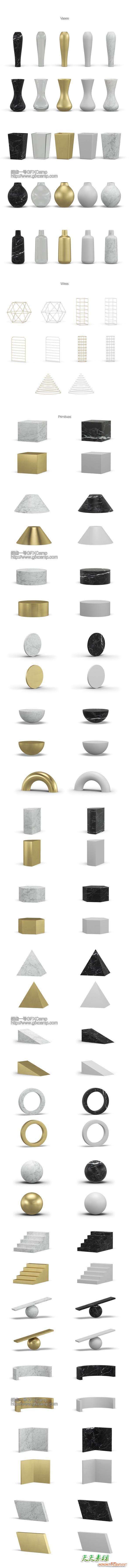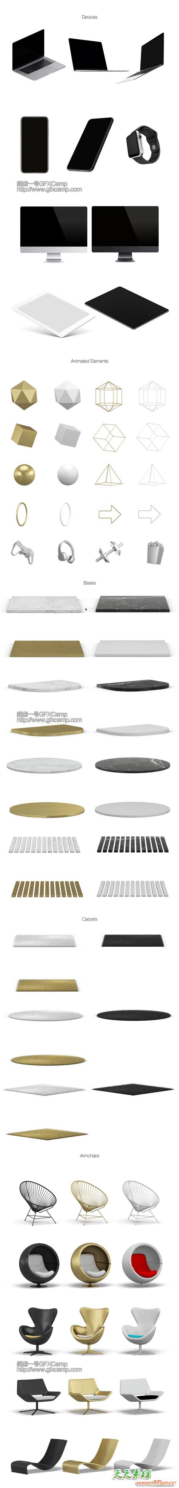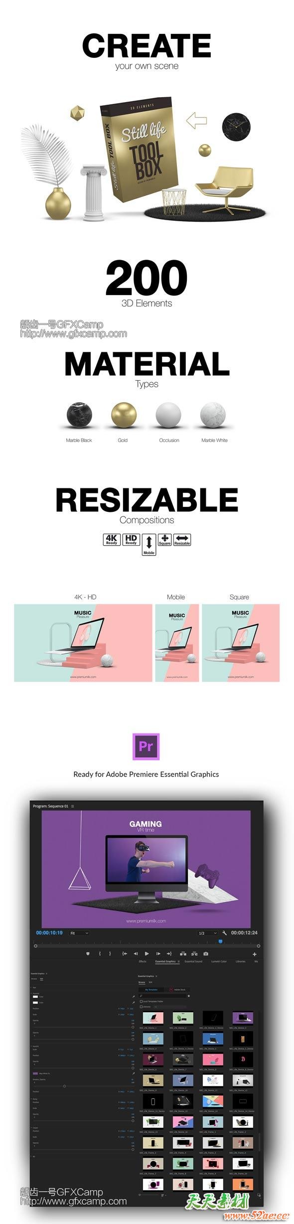 包含200+三维元素动画,每个元素有黑色大理石,金色,环境光,白色大理石三种材质,50组做好的三维场景动画可以直接使用,包含AE模板+PR预设两种形式