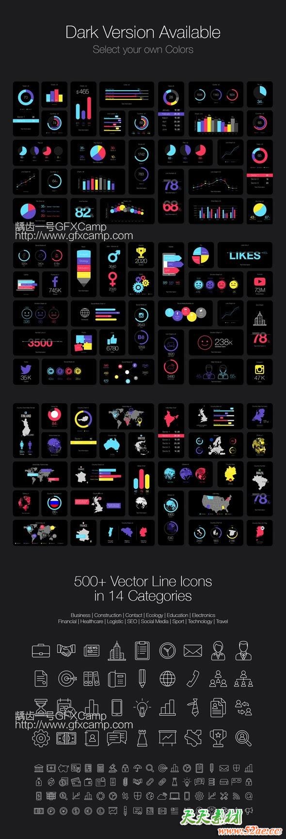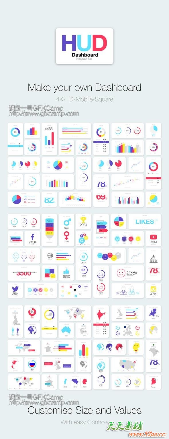 包含100组数据统计信息动画,所有的文字、数据、颜色、大小位置等都可以修改,另外包含500组线条风格图标动画