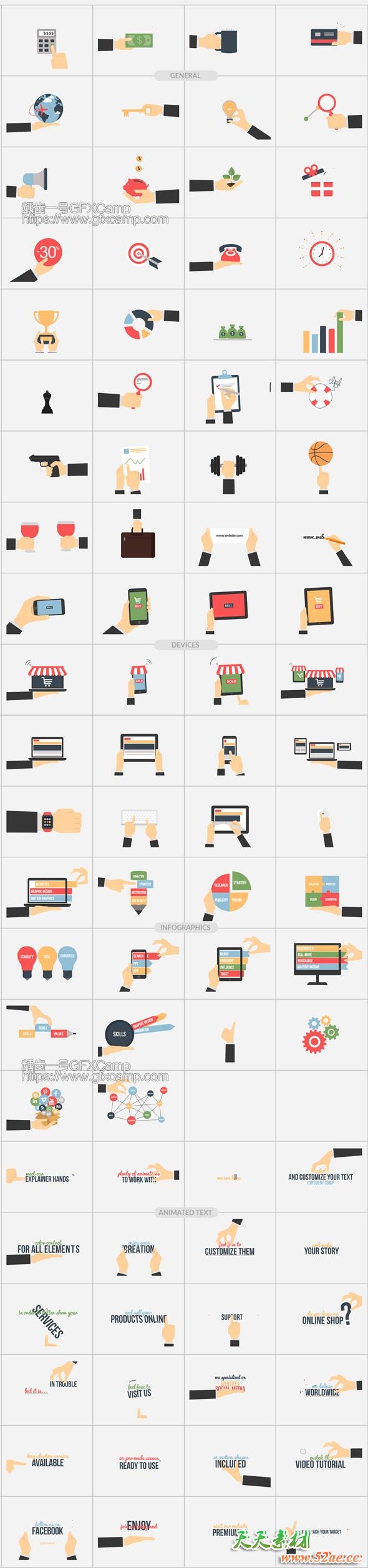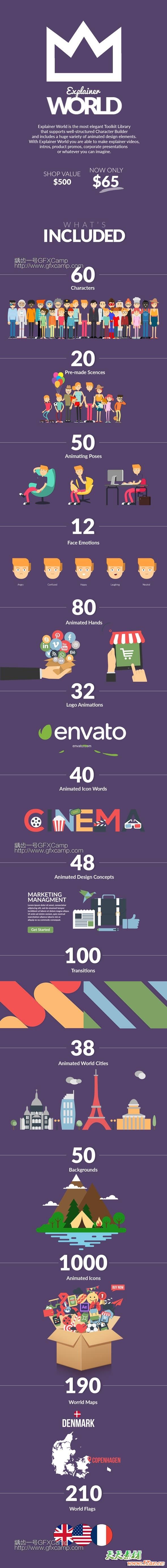 - 包含1000个ICON图标动画+390组地图旗帜动画+100组图形动画转场+80个手势动画+60个制作好的人物角色+50个角色动作+50个背景场景+40个文字标题+38个城市+32个Logo动画