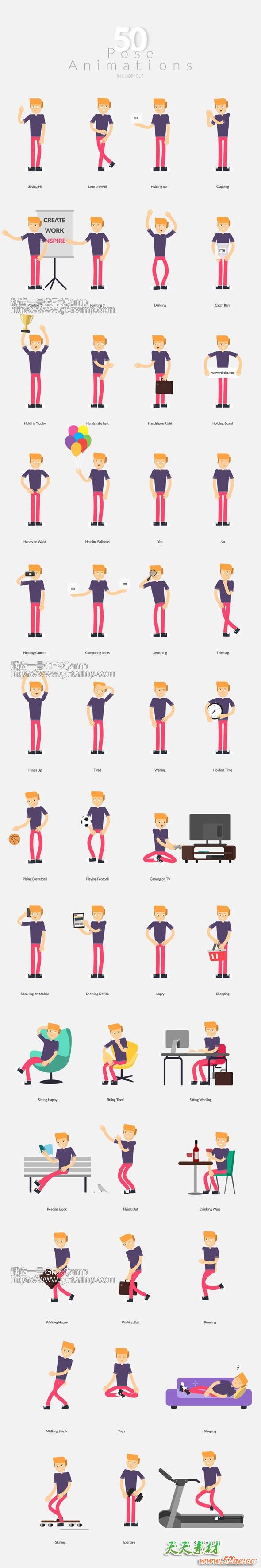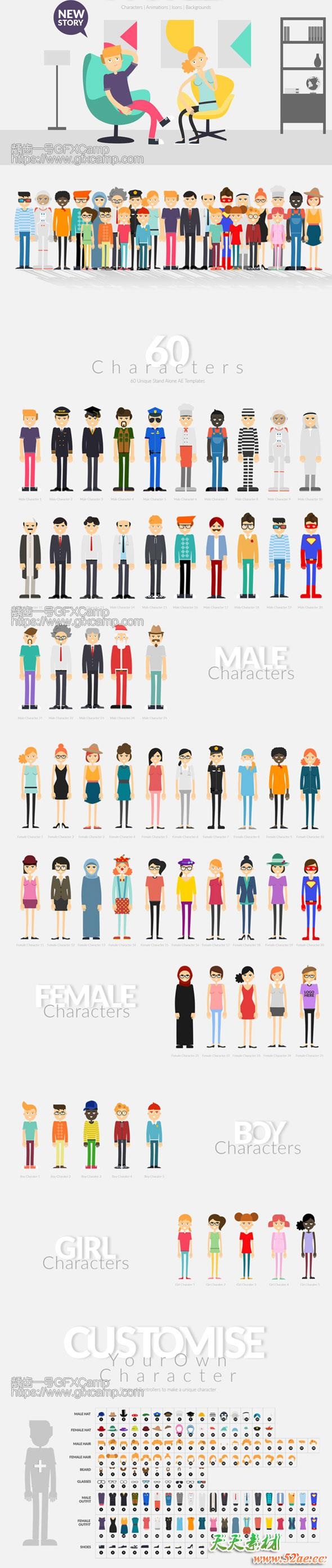 - 60个制作好的角色(25个男性+25个女性+5个男孩+5个女孩),每个角色都包含50个制作好的动作,可以直接使用,也可以根据多种外形服装搭配制作自己特有的人物,可以根据自己的音频做口型动画
