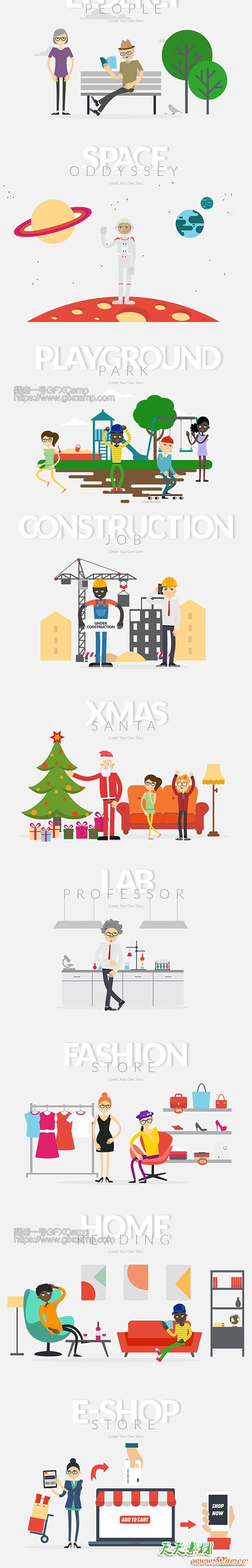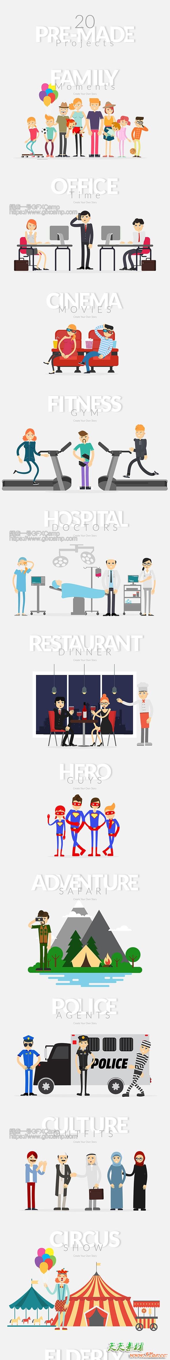 - 20个制作好的场景背景(家庭、办公室、电影院、健身、医院、餐厅、英雄,冒险,警察,文化,马戏团,老年人,空间,操场,建设,圣诞节,实验室,时尚,家里,网上购物)