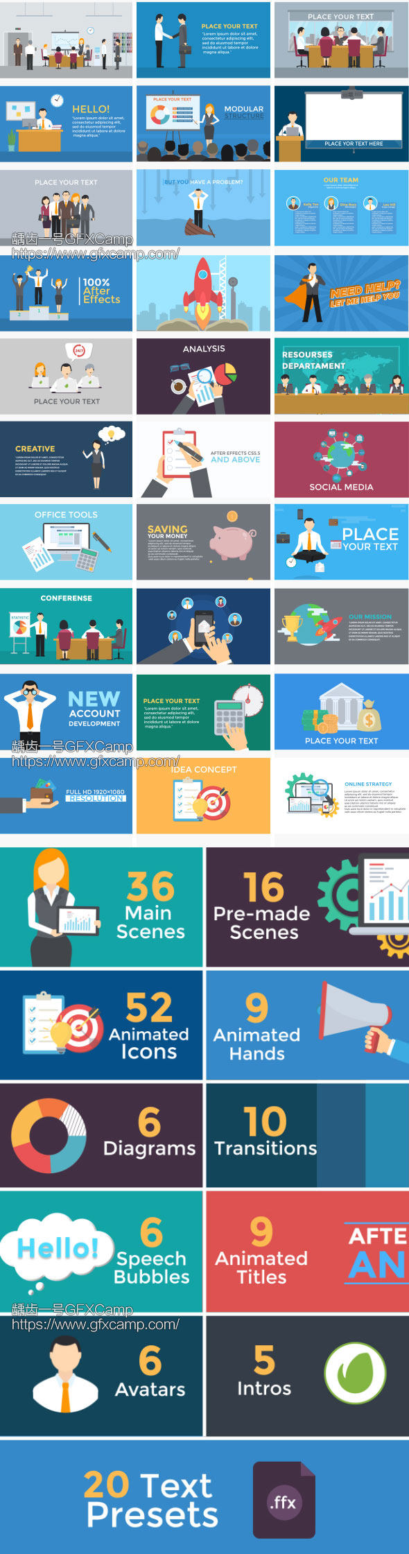 超过50个场景动画,50+图标icon动画,9个文字标题动画,9个手势动画,6个图表表格,10个图形转场,6个气泡对话框,5个Logo动画,20个文字懂阿胡预设。所有的元素全部在AE中制作,颜色动画等都可以修改