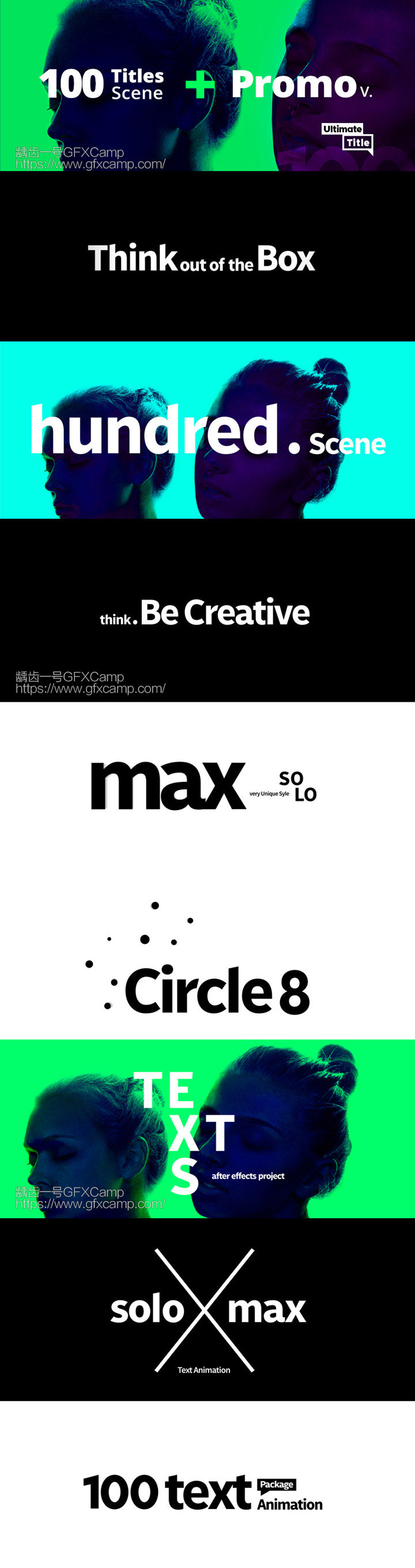 一共100组创意文字标题动画,使用用于快闪片头,背景的图片是不包含的,一个文字标题就是单独的合成,直接拖拽搭配自己的图片视频上使用即可