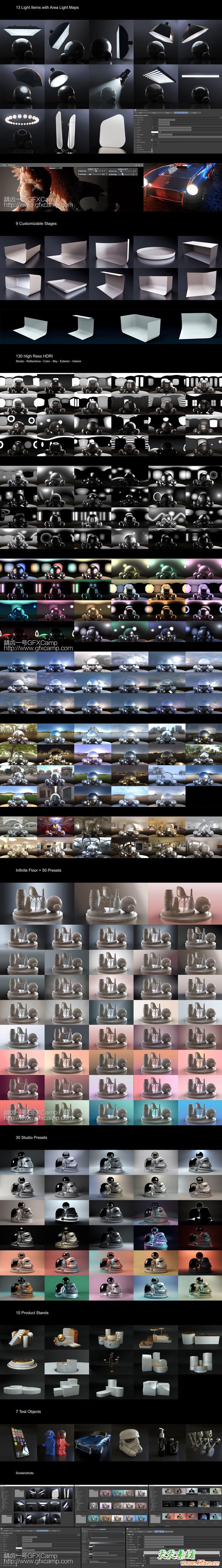 包含18组摄影棚灯光预设+9个U/L型舞台+130个HDRI预设+50个无限背景场景预设+30个摄影棚渲染预设+15个标准模型场景预设+7个测试物体模型场景,所有的场景都是可控的,只支持Redshift渲染器,默认或者其他渲染器无法使用