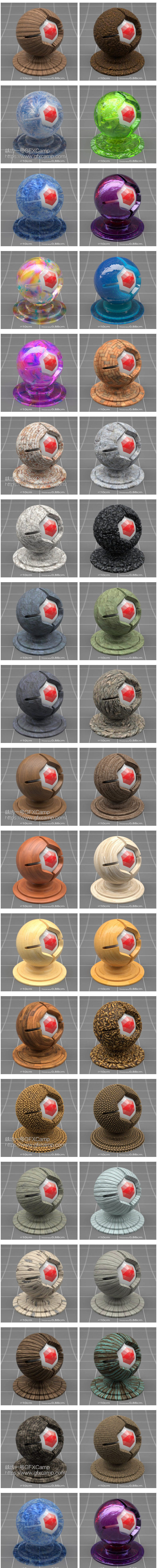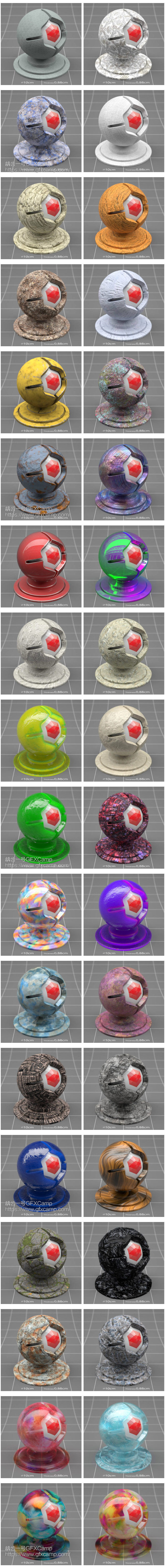 一共包含135个Redshift渲染器用的C4D材质预设,有陶瓷材质、混泥土材质、沥青材质、自发光材质、布料材质、地面材质、皮革材质、钢铁材质、有机材质、油漆材质、纸张材质、塑料材质、石膏材质、橡胶材质、石头材质、陶器材质、透明材质、木纹材质等
