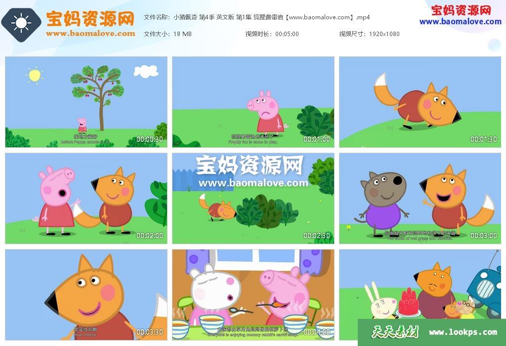 天天资源网收录的动画片《Peppa Pig》小猪佩奇英文版 第四季 全集26集,英语发音,内置中文和英文字幕;每集大小约23M,总大小575M,单集播放时长约5分钟,1080P高清MP4格式,可以在电视机或电脑、平板、IPAD、早教机、手机等各种设备播放,提供百度云网盘下载。