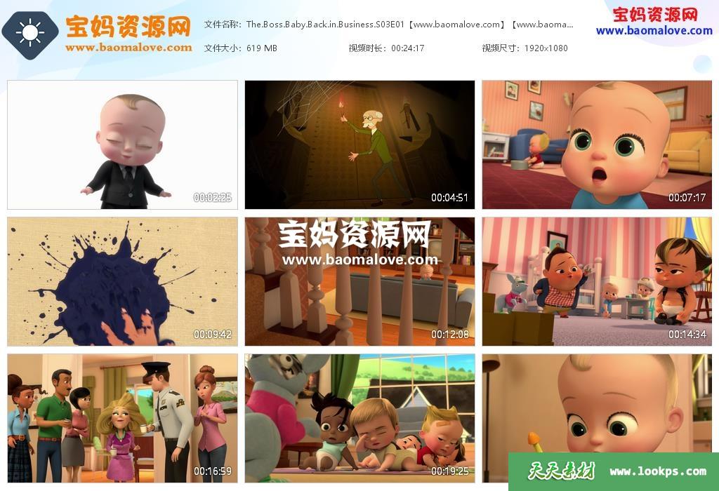 天天资源网收录的动画片《The Boss Baby: Back in Business》宝贝当家: 宝宝归来 第三季 全集11集,英语发音,内置英文字幕(内置多国语言字幕,如俄文,瑞典文,德文,挪威文,法文,意大利文,芬兰文等多国语言字幕…可以下载后使用播放器选择字幕或者关闭字幕);每集大小约600M,总大小7.23G,单集播放时长约24分钟,1080P高清MKV格式,可以在电视机或电脑、平板、IPAD、早教机、手机等各种设备播放,提供百度网盘下载。