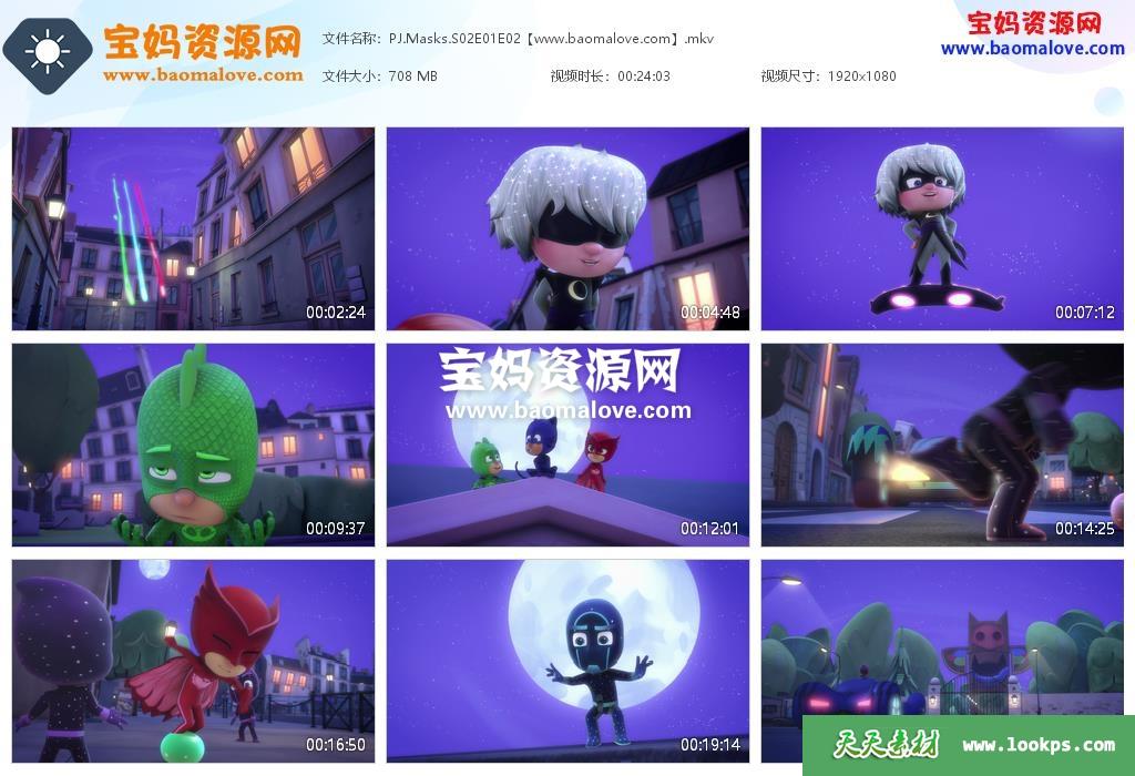 天天资源网收录的动画片《PJ Masks》睡衣小英雄英文版 第二季 全部52集,英语发音,内置英文字幕(可以下载后使用播放器设置字幕字体大小颜色或者关闭字幕);每集大小约360M,资源总大小18.7G,单集播放时长约12分钟,1080P高清MKV格式,可以在电视机或电脑、平板、IPAD、早教机、手机等各种设备播放,提供百度网盘下载。