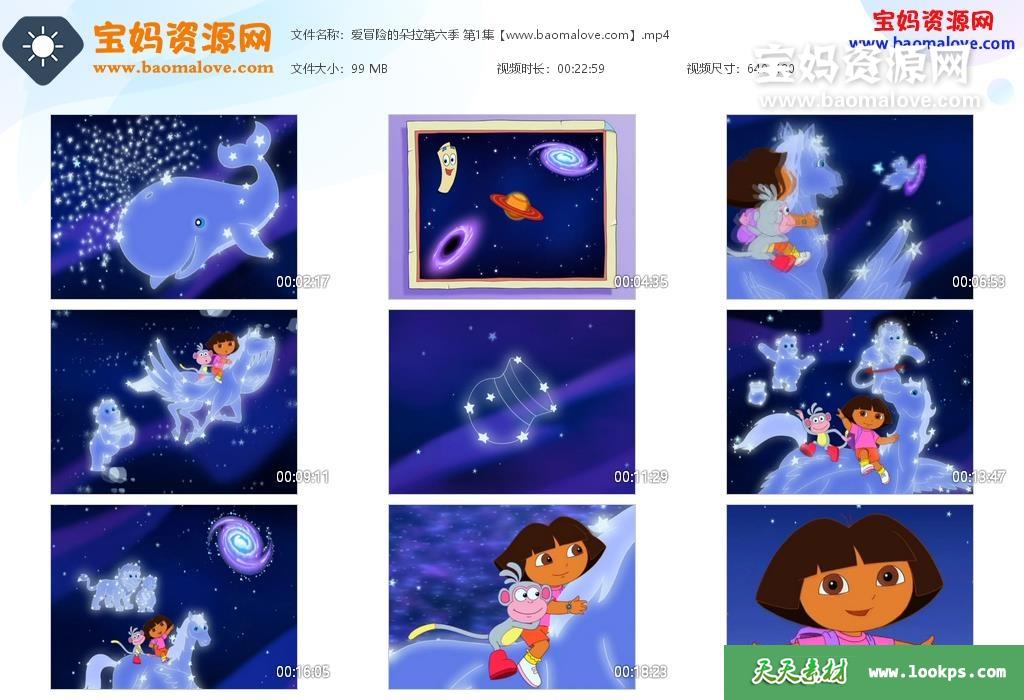 天天资源网收录的《爱探险的朵拉》Dora The Explorer中文版 第六季,全部20集,国语发音,无字幕;每集大小约100M,总大小1.94G,单集播放时长约24分钟,480P高清MP4格式,可以在电视机或电脑、平板、IPAD、手机等各种设备播放,提供百度云网盘下载!