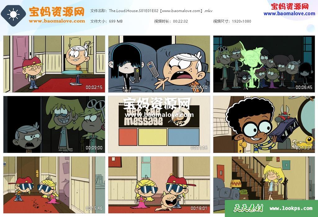 天天资源网收录的动画片《The Loud House》劳德之家英文版 第一季,全部52集,英语发音,内置英文字幕(可以下载后使用播放器选择设置字幕或者关闭字幕);每集大小约400M,资源总大小21.7G,单集播放时长约11分钟,1080P高清MKV格式,可以在电视机或电脑、平板、IPAD、早教机、手机等各种设备播放,提供百度云网盘下载。