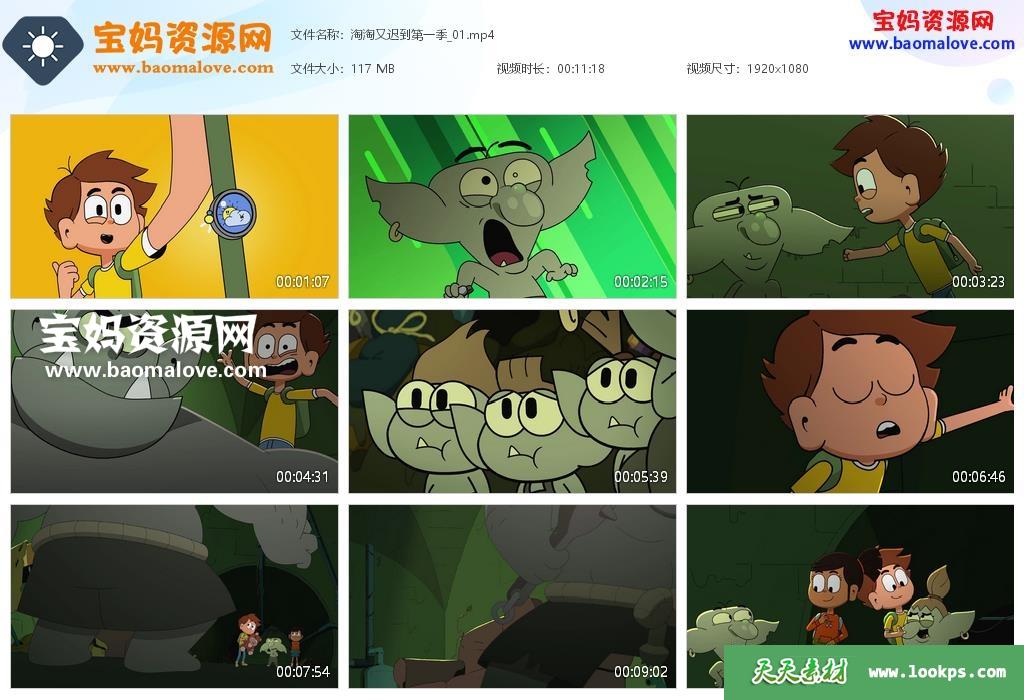 天天资源网收录的动画片《淘淘又迟到》Nate Is Late中文版 第一季,全部22集,国语发音,无字幕;每集大小约130M,总大小7.26G,单集播放时长约11分钟,1080P高清MP4格式,可以在电视机或电脑、平板、IPAD、早教机、手机等各种设备播放,提供百度云网盘下载。