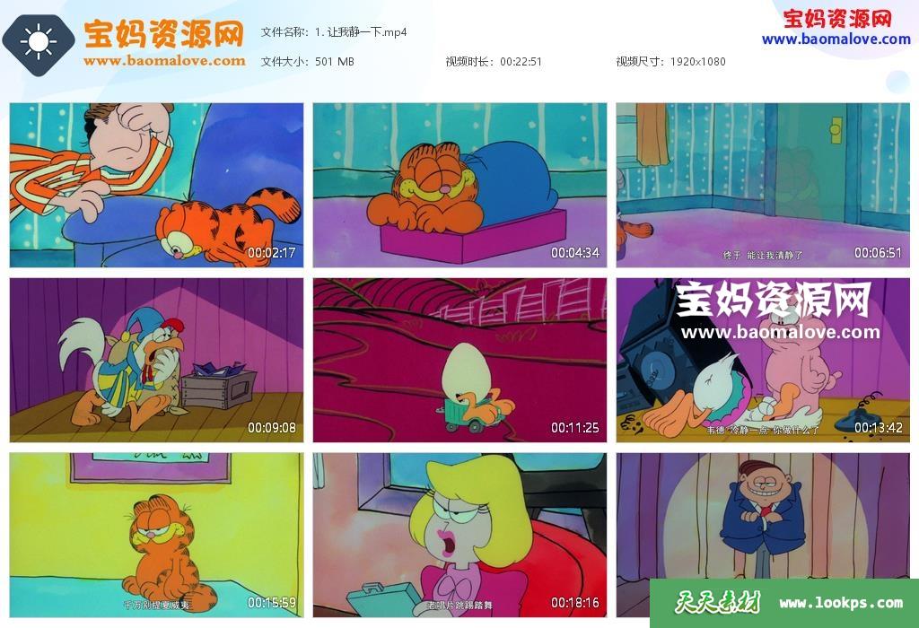 天天资源网收录的动画片《加菲猫和他的朋友们》Garfield and Friends中文版 第一季,全部13集,国语发音,中文字幕;每集大小约450M,资源总大小6.08G,单集播放时长约23分钟,1080P高清MP4格式,可以在电视机或电脑、平板、IPAD、早教机、手机等各种设备播放,提供百度云网盘下载。