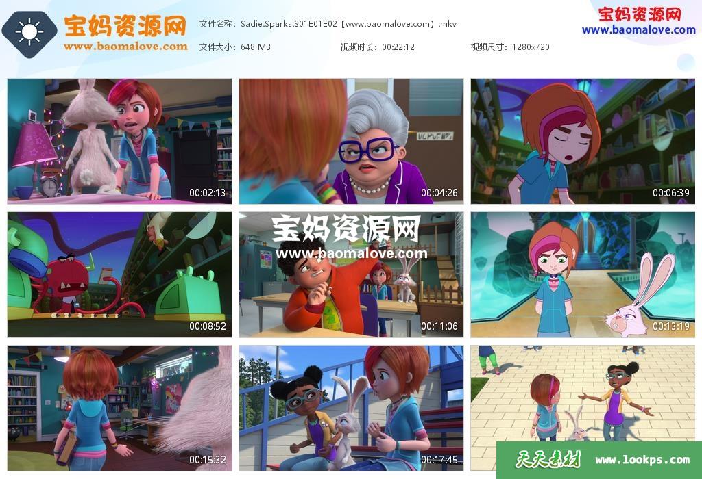 天天资源网收录的动画片《Sadie Sparks》第一季,全部52集,英语发音,内置英文字幕(可以下载后使用播放器选择设置字幕或者关闭字幕);每集大小约330M,资源总大小16.6G,单集播放时长约11分钟,720P高清MKV格式,可以在电视机或电脑、平板、IPAD、早教机、手机等各种设备播放,提供百度云网盘下载。