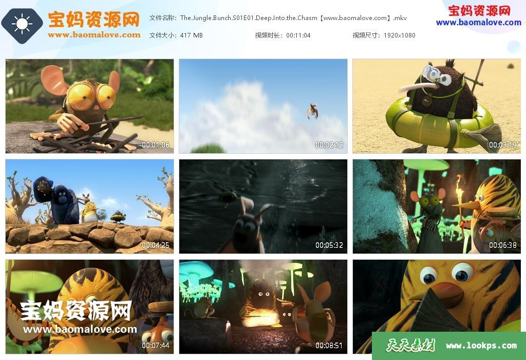 天天资源网收录的动画片《The Jungle Bunch》丛林特战队英文版 第一季,全部52集,英语发音,内置英文字幕(可以下载后使用播放器选择设置字幕或者关闭字幕);每集大小400M,资源总大小21.8G,单集播放时长约11分钟,1080P高清MKV格式,可以在电视机或电脑、平板、IPAD、早教机、手机等各种设备播放,提供百度云网盘下载。