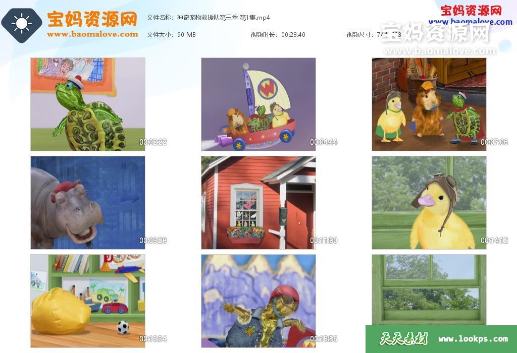 天天资源网收录的动画片《神奇宠物救援队》Wonder Pets!中文版 第一二季,全40集,国语发音,无字幕; 每集大小约100M,资源总大小4.2G,单集播放时长约23分钟,568P标清MP4格式,右上角有腾-迅-视频水印可以在电视机或电脑、平板、IPAD、早教机、手机等各种设备播放,提供百度云网盘下载。