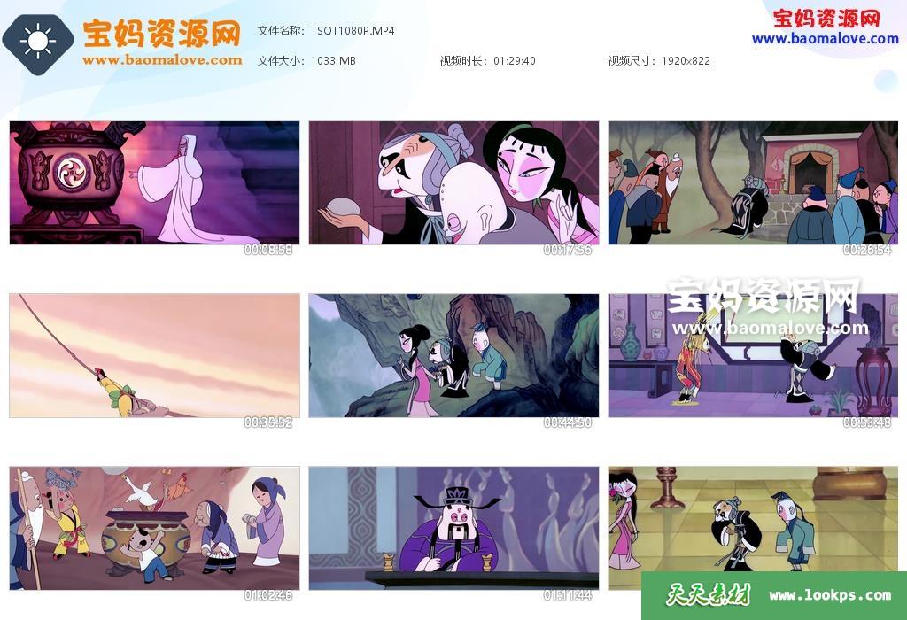 天天资源网收录的动画电影《天书奇谭》,国语发音,无字幕;资源大小约1G,播放时长约90分钟,822P高清MP4格式,可以在电视机或电脑、平板、IPAD、早教机、手机等各种设备播放,提供百度云网盘下载。