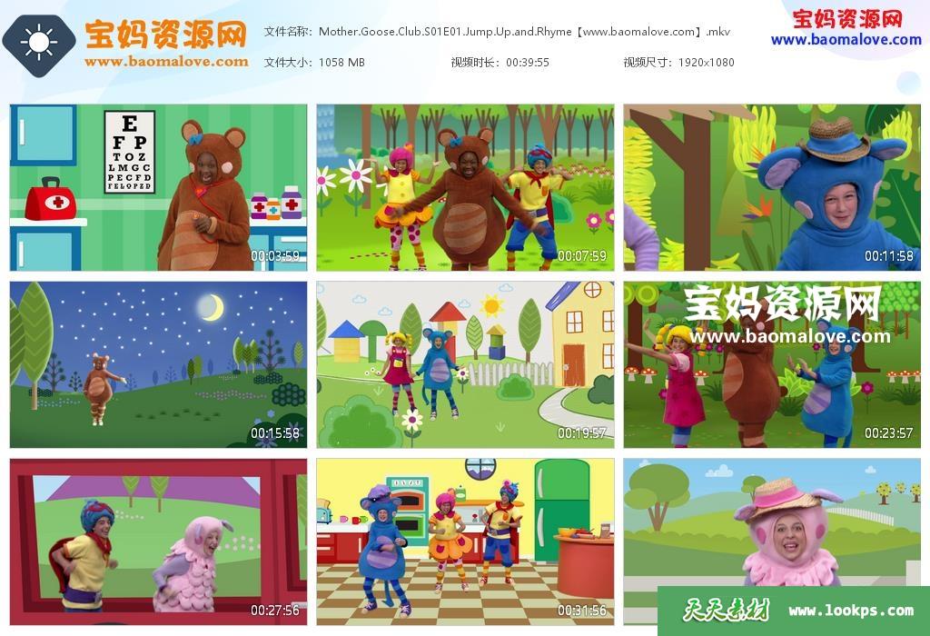 天天资源网收录的动画片《Mother Goose Club》鹅妈妈俱乐部英文版 第一二季,全部10集,英语发音,内置英文字幕(可以下载后使用播放器选择设置字幕或者关闭字幕);每集大小约900M,资源总大小9.55G,单集播放时长约40分钟,1080P高清MKV格式,可以在电视机或电脑、平板、IPAD、早教机、手机等各种设备播放,提供百度云网盘下载。