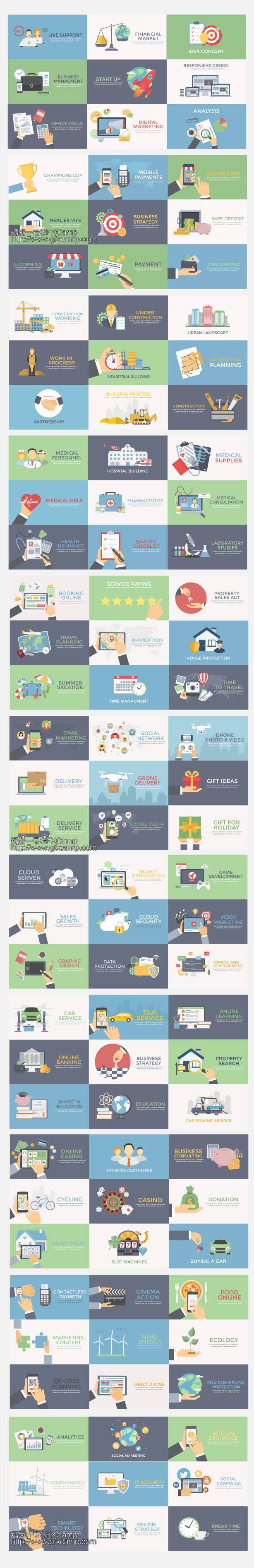 包含100组场景动画+225组图标ICON动画+23组手势动画+12个文字标题+12个图形转场+5个Logo动画,方便查找使用,包含AE模板和PR预设两个版本,所有元素的颜色、大小位置、文字、字体等基本参数都可以修改