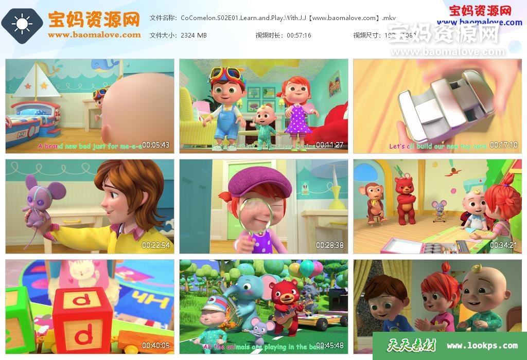 天天资源网收录的动画片《Cocomelon》可可瓜儿歌英文版 第二季,全部3集,英语发音,英文字幕;每集大小约2.2G,资源总大小6.61G,单集播放时长约60分钟,1080P高清MKV格式,可以在电视机或电脑、平板、IPAD、早教机、手机等各种设备播放,提供百度云网盘下载。