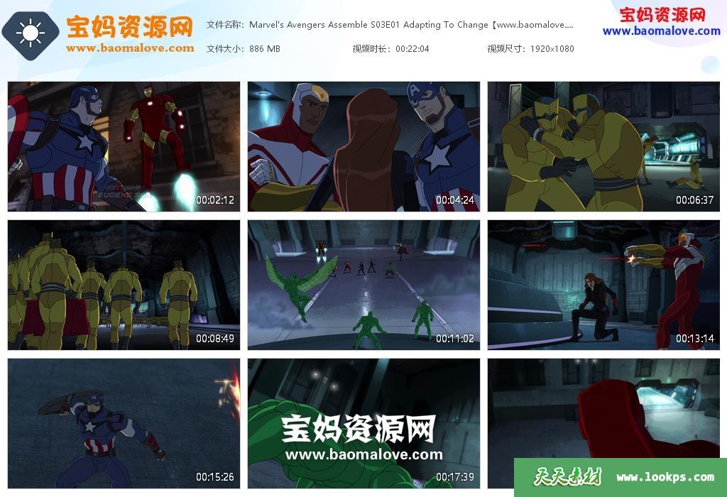 天天资源网收录的动画片《Marvel’s Avengers Assemble》复仇者集结英文版 第三季,全部26集,英语发音,内置英文字幕(可以下载后使用播放器选择字幕或者关闭字幕);每集大小约800M,资源总大小19.9G,单集播放时长约22分钟,1080P高清MKV格式,可以在电视机或电脑、平板、IPAD、早教机、手机等各种设备播放,提供百度云网盘下载。