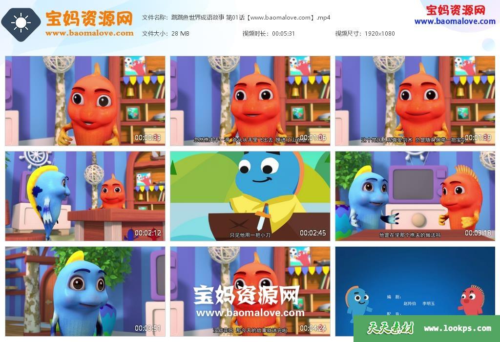 天天资源网收录的动画片《跳跳鱼世界成语故事》,全部52集,国语发音,中文字幕;每集大小约22M,资源总大小1.31G,单集播放时长约5分钟,1080P高清MP4格式,可以在电视机或电脑、平板、IPAD、早教机、手机等各种设备播放,提供百度云网盘下载。
