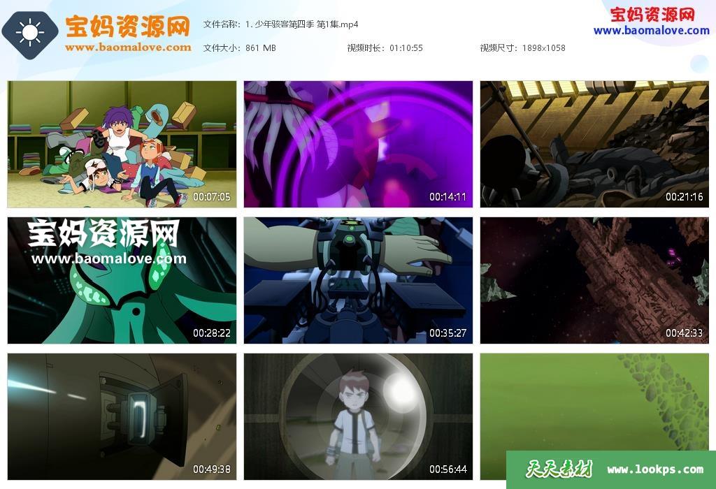 天天资源网收录的动画片《少年骇客》Ben 10中文版 第四季 ,全部11集,国语发音,无字幕;每集大小约280M,总大小3.54G,单集播放时长约23分钟,1080P高清MP4格式,可以在电视机或电脑、平板、IPAD、早教机、手机等各种设备播放,提供百度云网盘下载。